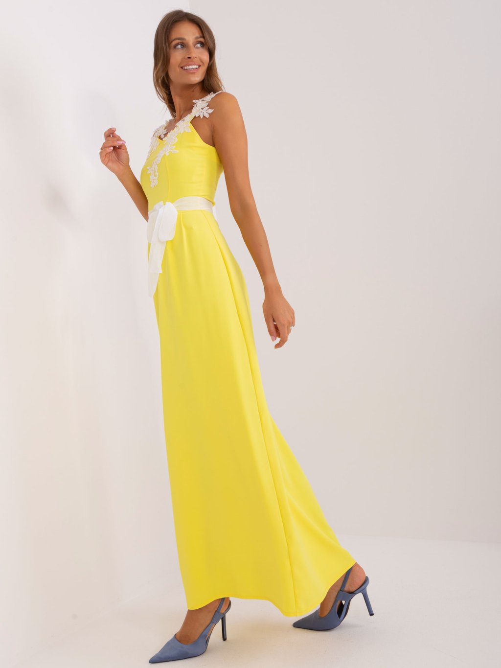 Dámské žluté šaty s krajkovými aplikacemi – maxi, elegantní